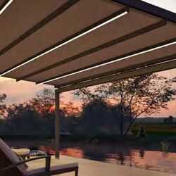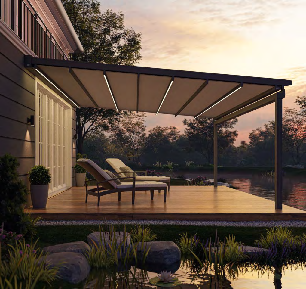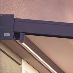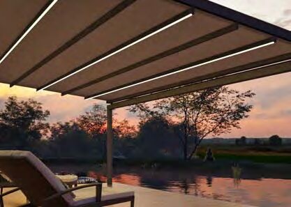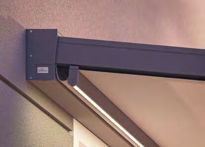 Für eine stimmungsvolle Inszenierung des Terrassenraums kann die Positano mit LED-Streifen in den Tuchhalteprofilen ausgestattet werden, optional auch mit Funksteuerung und Einbindung in die Hausautomation (Smart Home).