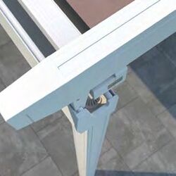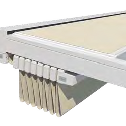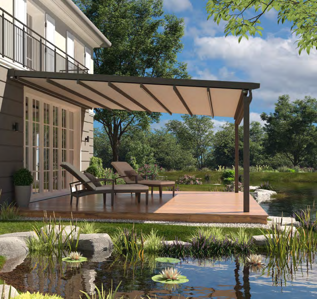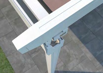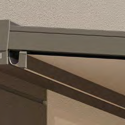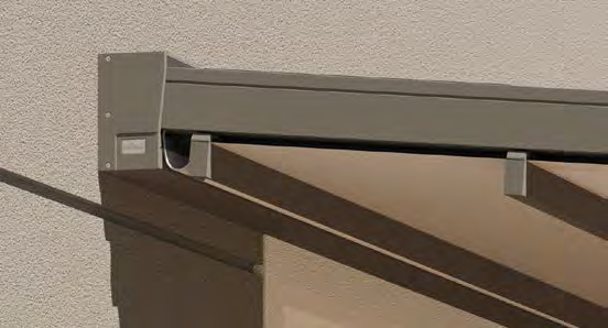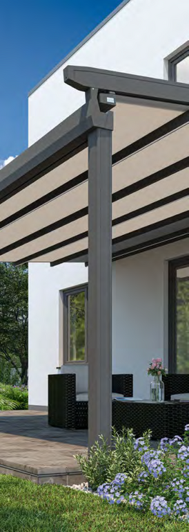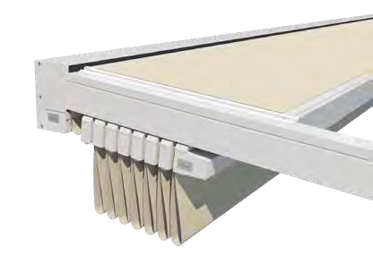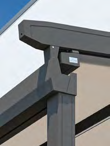 Hochpräzise Zahnriementechnik sorgt für gleichmäßiges Ein- und Ausfahren und die Spannung der Tuchabschnitte. Regenwasser wird über die Tuchfl he, die Regenrinne und unsichtbar durch das Innere der Pfosten abgeleitet.