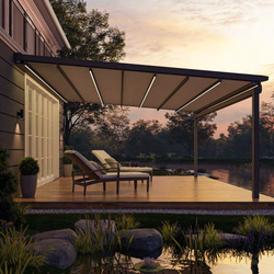 Die Wetterschutzpergola Positano bietet Komfort und Ausstattung für höchste Ansprüche. Mit einer regendichten Bespannung schafft diese Markise großzügige Terrassenräume von bis zu 42 m2 mit variablem Wetterschutz. Als perfekte Ergänzung bietet sich die Zip-Senkrechtmarkise Micro 2020 mit Screen-Bespannung als passgenauer Sicht- und Sonnenschutz für die Frontseite an.