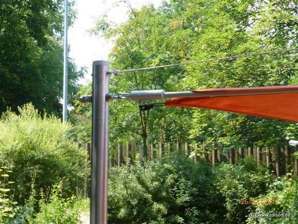 Sonnensegel mit manuell aufrollbarer Bedienung werden über eine Diagonalwelle mit einem Seil und einer äußerst leichtgängingen Umlaufrolle aufgerollt.