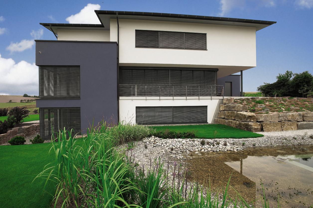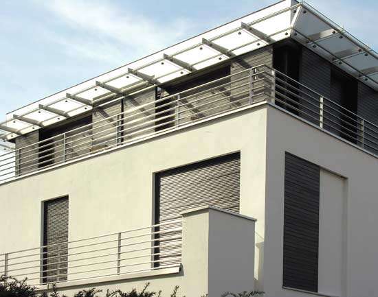 passen sich fast jeder Fassade harmonisch an. Sie eignen sich besonders für die Verschattung von schrägen und senkrechten Fassadenflächen. Die Führungsschienen können auch über mehrere Geschosse dem Verlauf der Fassade angepasst werden.