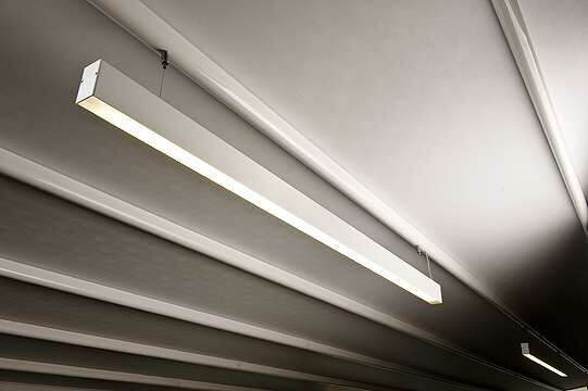 Leuchtkörper zum Aufhängen aus stranggepresstem, weiß oder elfenbein lackiertem Alluminium.