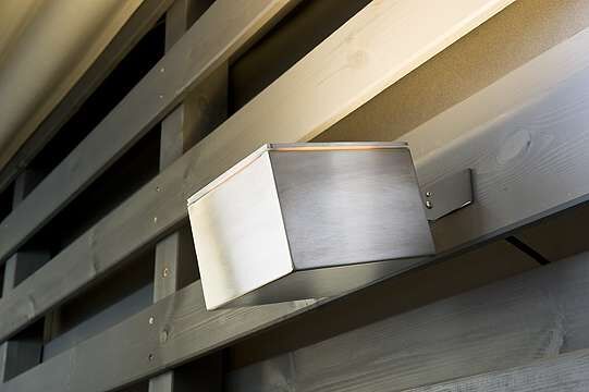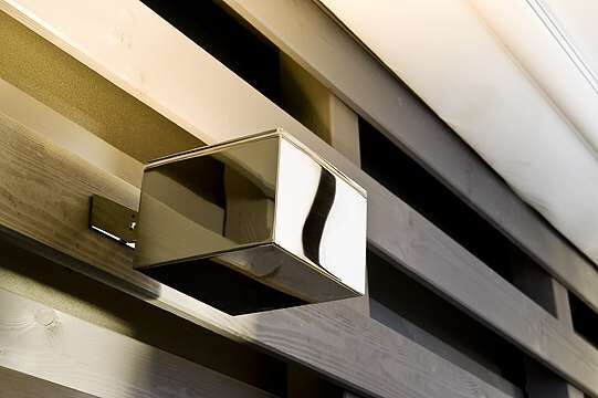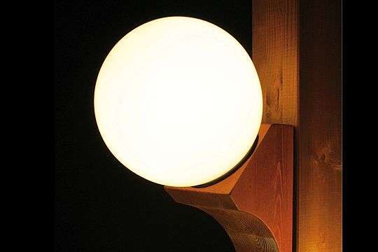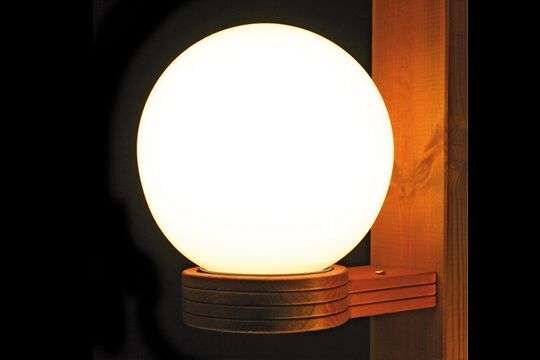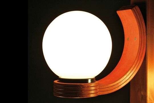 Lampen mit Halterungen aus Lamellenholz, im Druckkessel imprägniert, in den Musterfarben erhältlich. Kugel aus Acrylglas, rauch- oder opalfarben. Ohne Leuchtkörper.