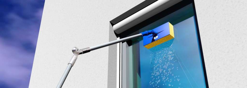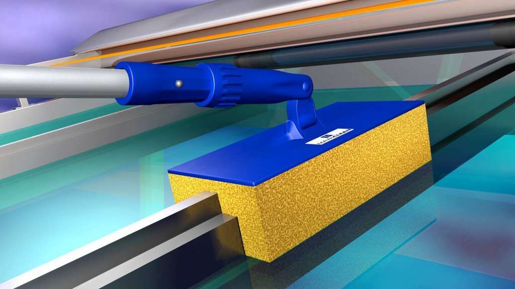 Reinigungsschwämme sind speziell auf Terrassenüberdachungen angepasst und ermöglichen die Reinigung der sonst so schwer zu erreichenden Kanten zwischen Profil und Glas. Mit einem speziellen Gelenkaufsatz lässt sich auch beim Abziehen des Wassers ein gleichbleibender Winkel erreichen durch den das Glas sauber und Schlieren frei gereinigt werden kann.